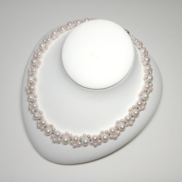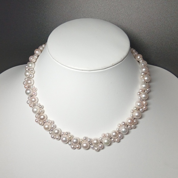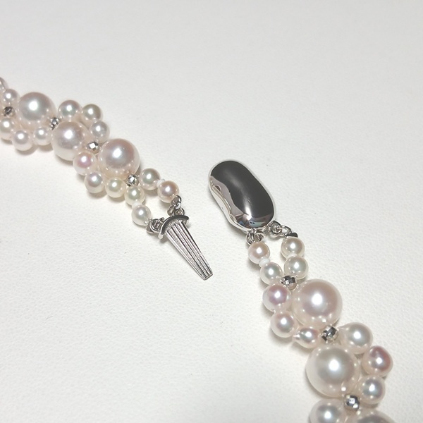 大小のサイズの異なるアコヤ真珠に、SILVERのミラーボールを入れて編んだネックレスです。