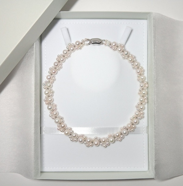 アコヤ真珠を贅沢に使用し、一粒一粒丁寧に編んでお作りしております。