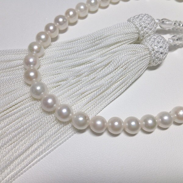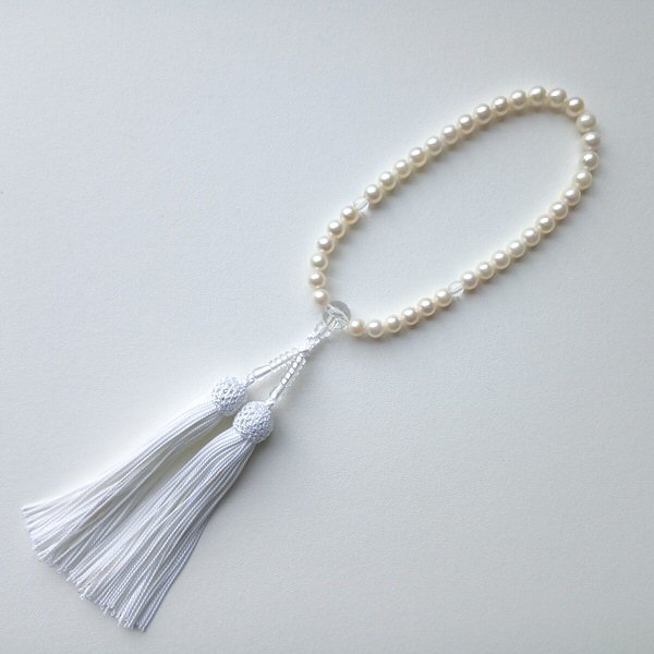 女性の手に馴染む丁度良いサイズの念珠です。柔らかなホワイト系の真珠と房が清楚な印象に。アコヤ真珠ならではの艶としっとりとした感触です。