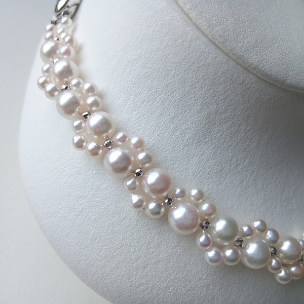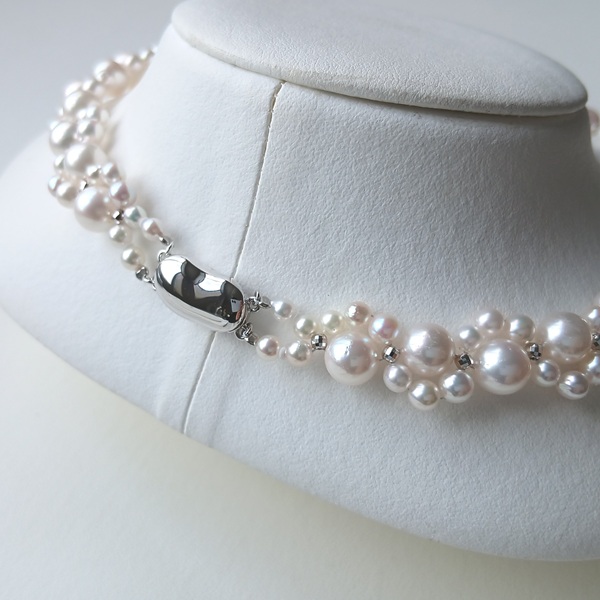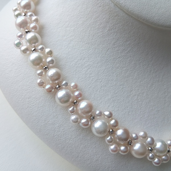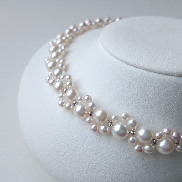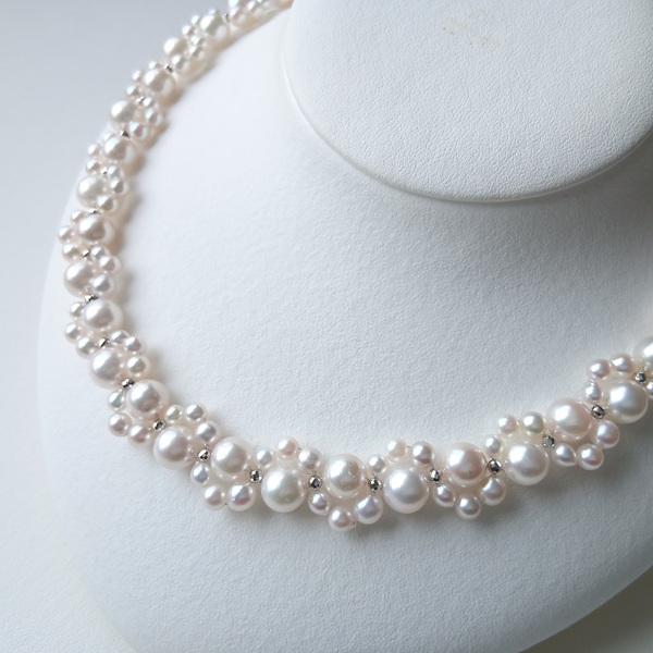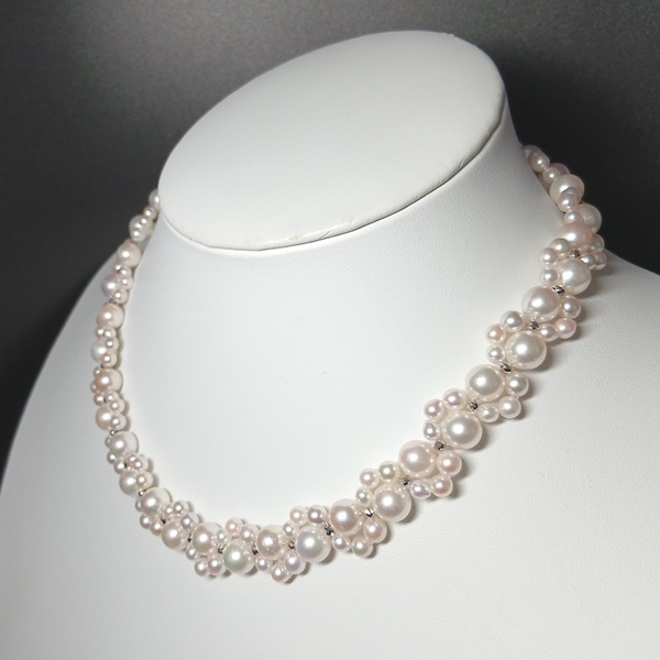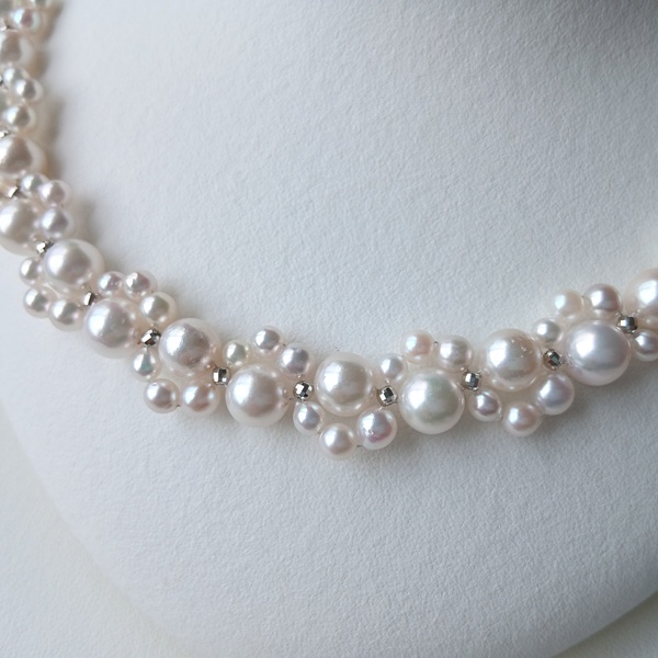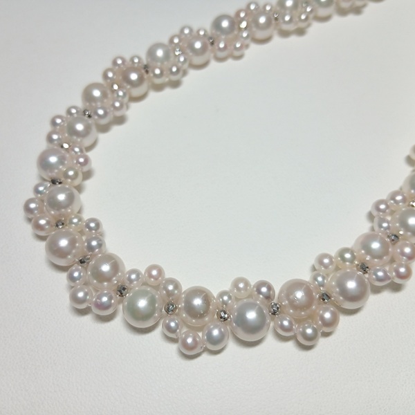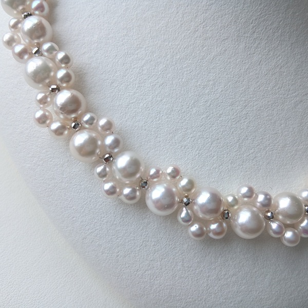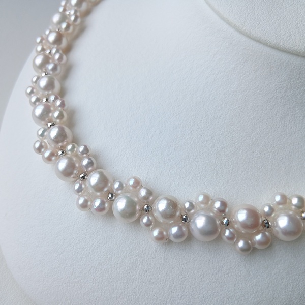 大小のサイズの異なるアコヤ真珠に、SILVERのミラーボールを入れて編んだネックレスです。
