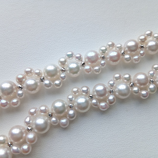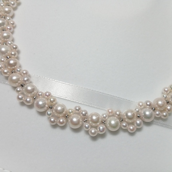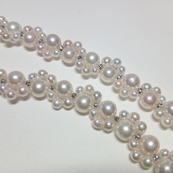 アコヤ真珠を贅沢に使用し、一粒一粒丁寧に編んでお作りしております。