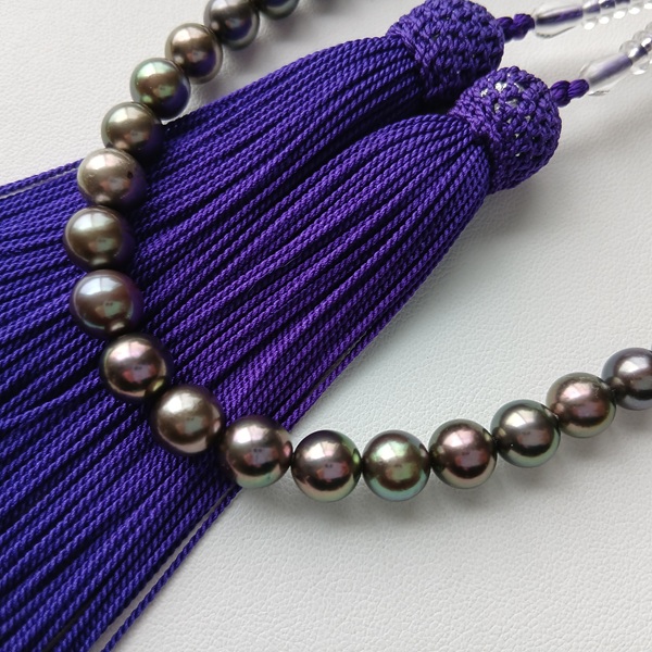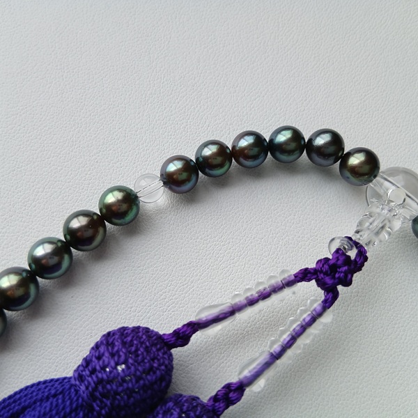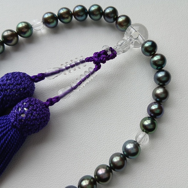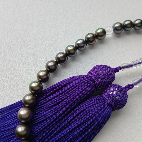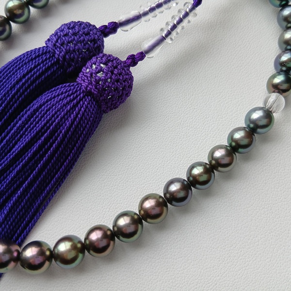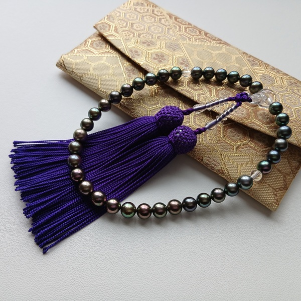 GOT04【限定お宝商品】現品限り アコヤ真珠 染黒 念珠 7.0~8.0㎜ 水晶・正絹房 念珠袋付 お数珠 ピーコックカラー ブラックパール