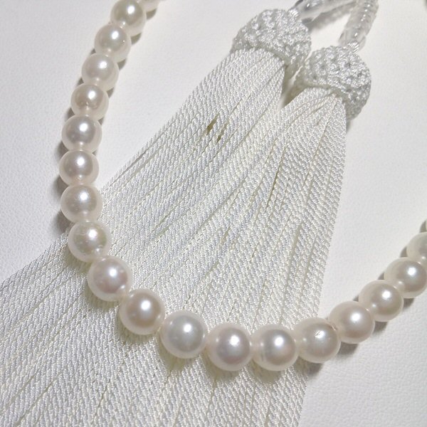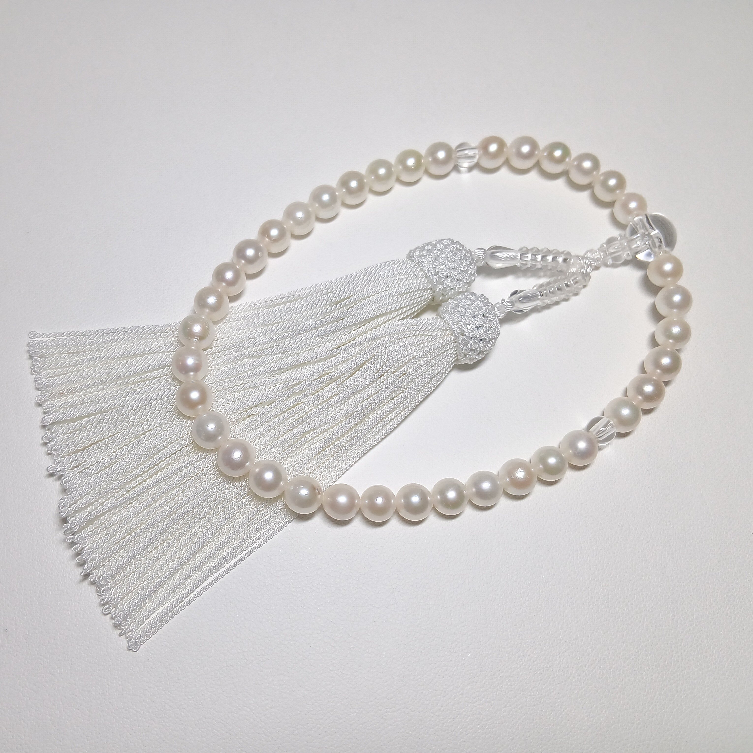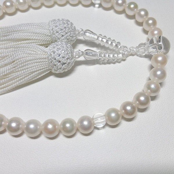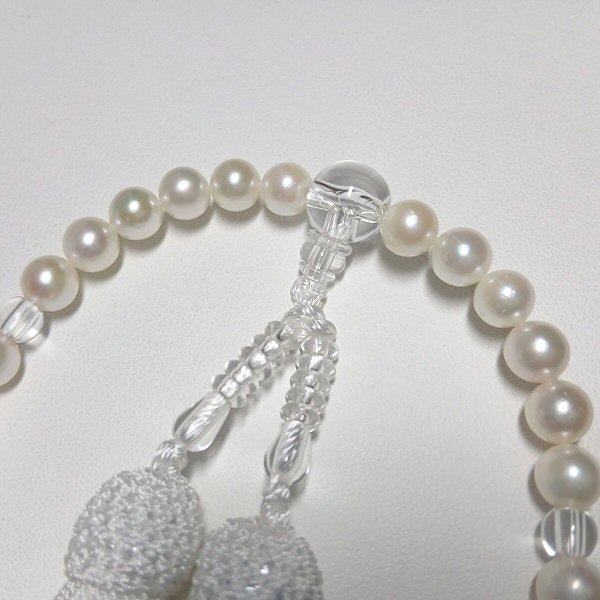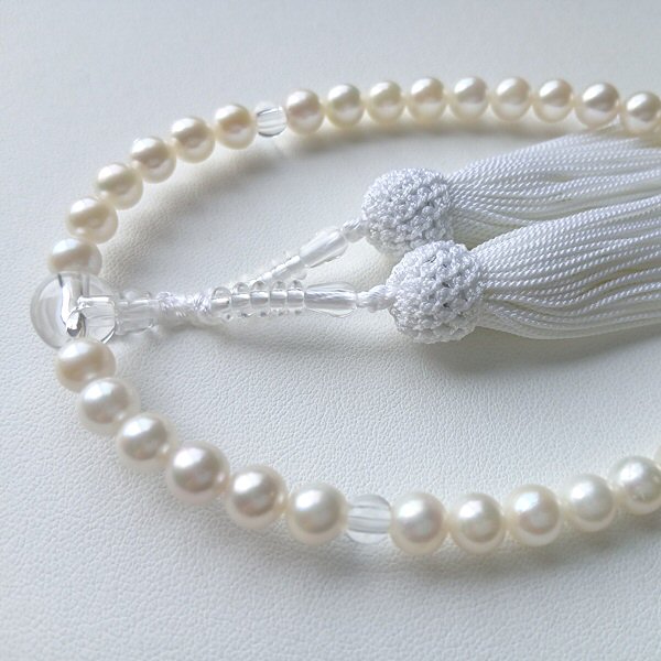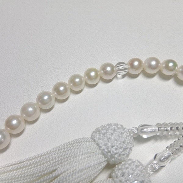 女性の手に馴染む丁度良いサイズの念珠です。柔らかなホワイト系の真珠と房が清楚な印象に。アコヤ真珠ならではの艶としっとりとした感触です。