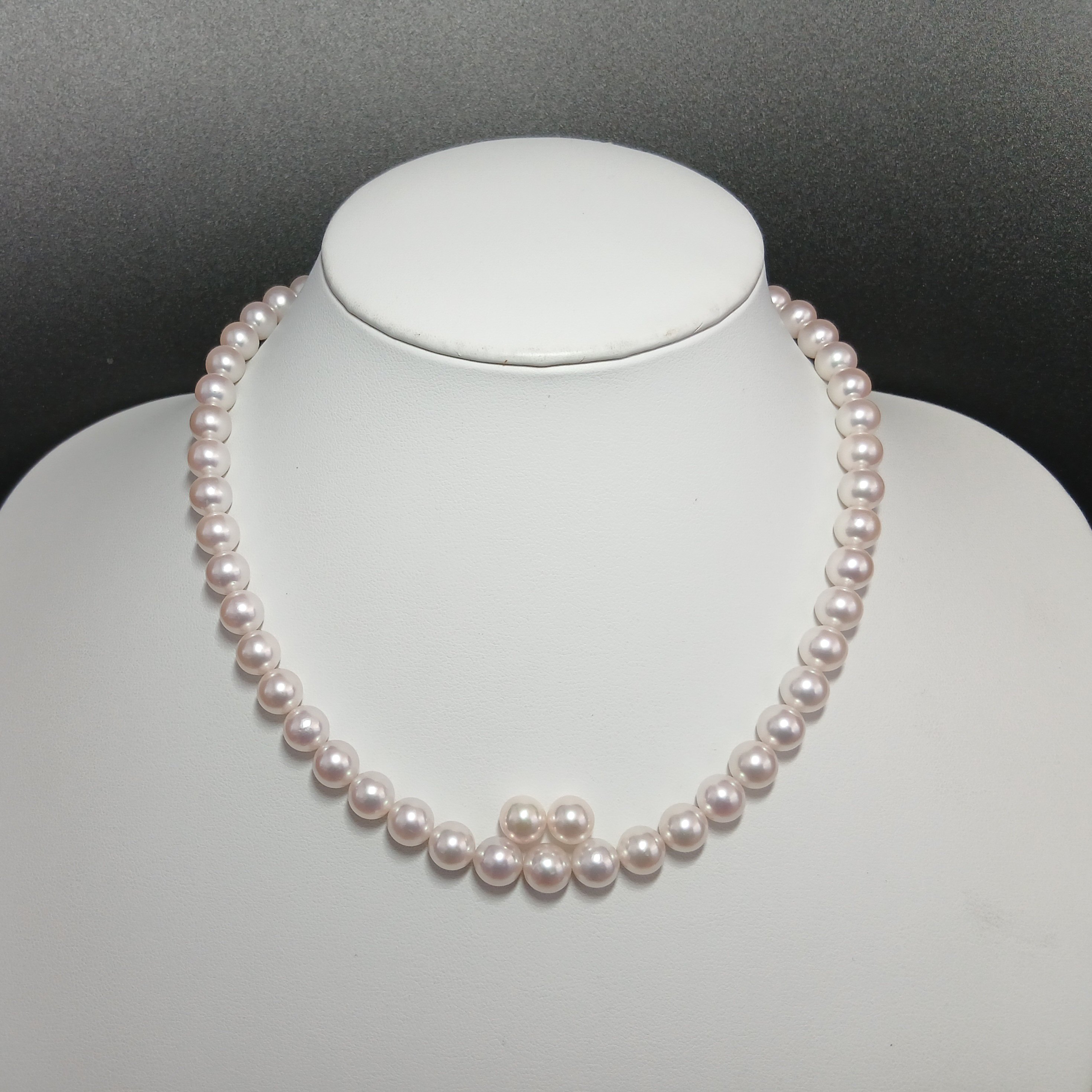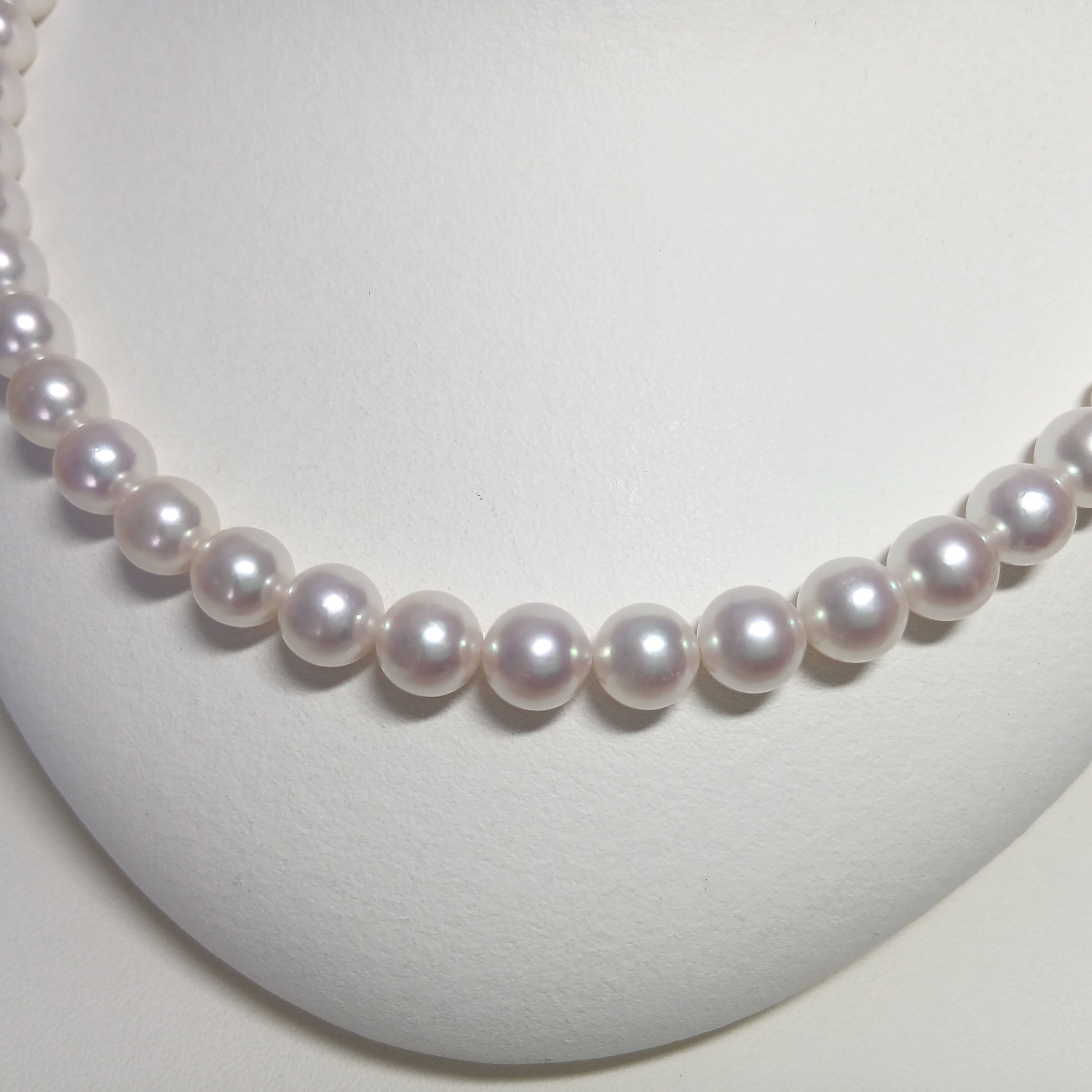 フォーマルに最適な定番サイズですので、ワンセットお持ちいただくと安心です。ボリューム感もある艶やかなピンク系のアコヤ真珠が、胸元を彩ります。